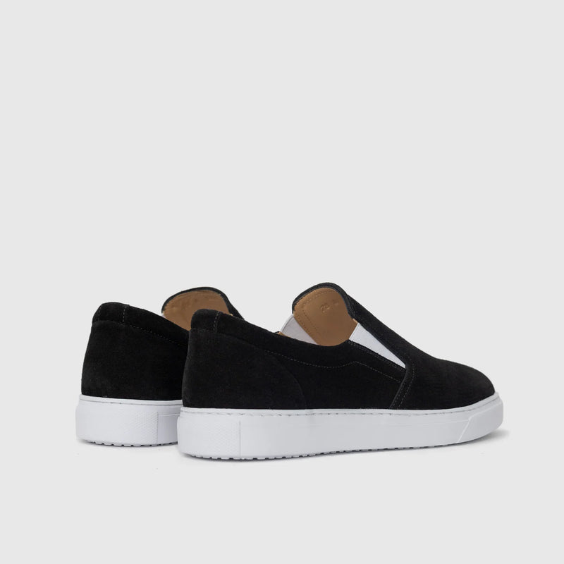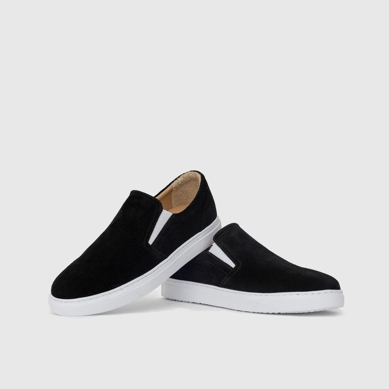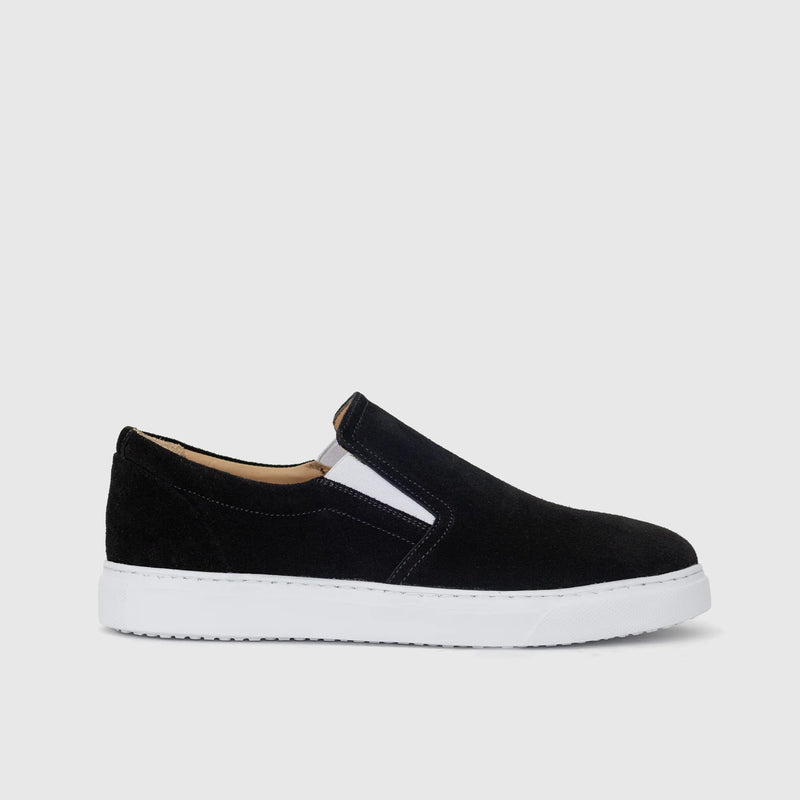 California Vibe capture l’allure californienne : tige en daim noir minimaliste, enfilage sans lacets et semelle blanche amortie qui passe du skate-park au café en toute aisance.
