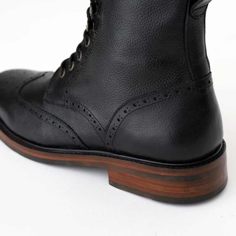 Cette bottine revisite le classique full brogue avec un cuir grainé de caractère, offrant une élégance intemporelle capable d'affronter le quotidien avec distinction.
